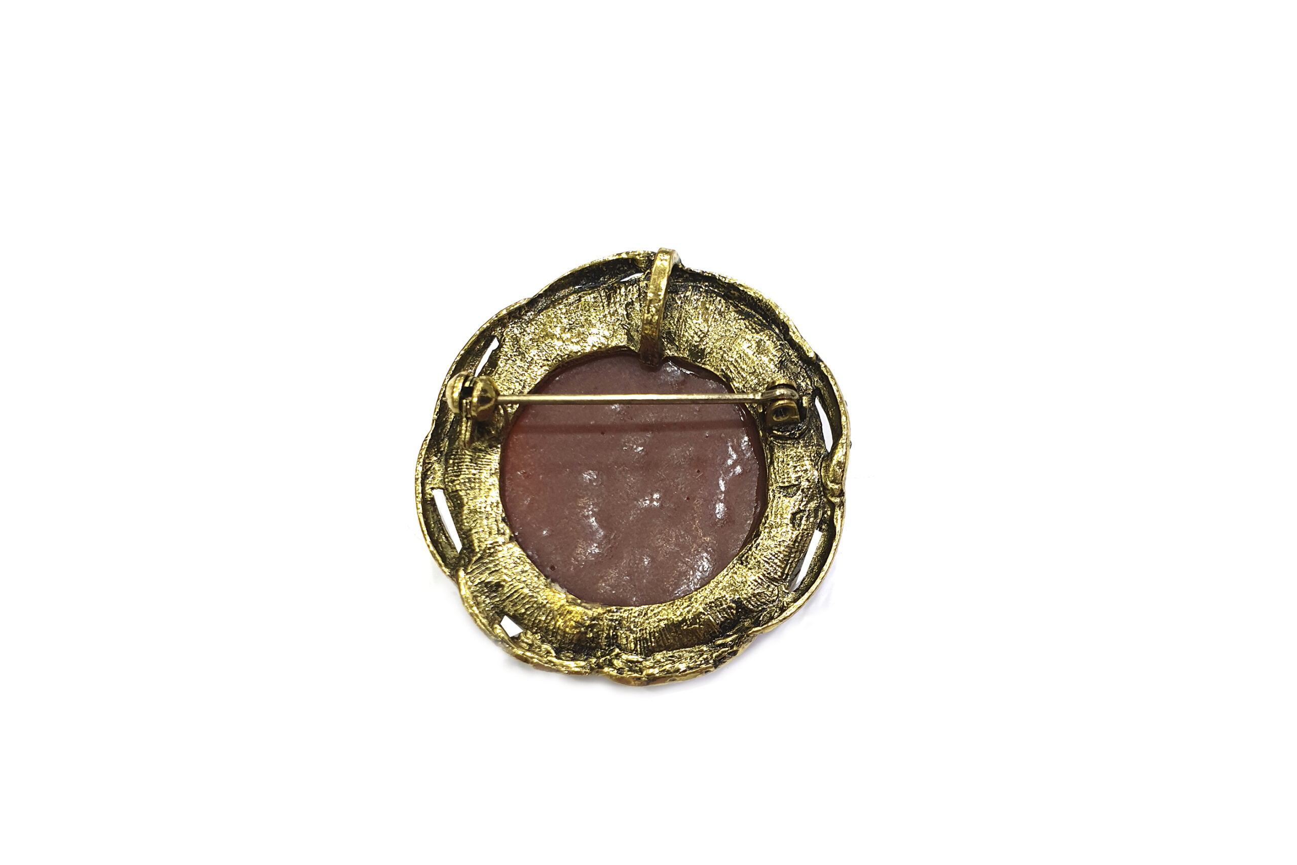 Broche de bisutería, en dorado, de medidas 5,00 cms x 5,00 cms con camafeo.