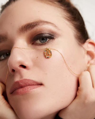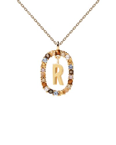 Collar de inicial R en plata con baño de oro, rodeada de piedras de colores