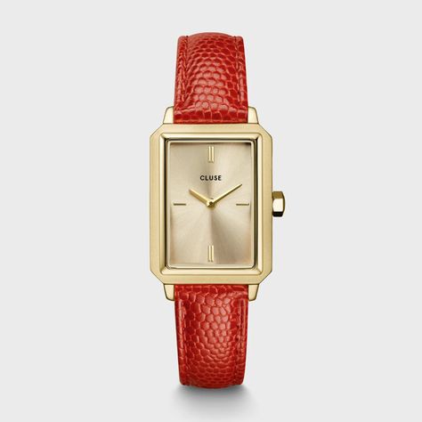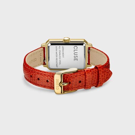 Atrevido. Elegante. Sofisticado. Si quieres marcar tendencia, el reloj Fluette para mujer en piel de lagarto coral y dorado es tu mejor aliado. Diseñado con caja rectangular dorada pulida de 30,6 mm, esfera de rayos de sol color champán y correa de piel de lagarto de 14 mm en color coral. Con su forma rectangular única y su estilo minimalista, CLUSE ha diseñado cuidadosamente este llamativo reloj con un objetivo clave en mente: ofrecer un reloj sofisticado con una fuerte presencia. Puedes ajustar fácilmente el tamaño de la correa tú misma. El tiempo corre: ¡es hora de rematar tu look con esta pieza de tendencia!