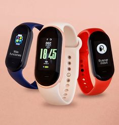 Colores disponibles: negro con correa roja, azul con correa naranja y blanco con correa beige