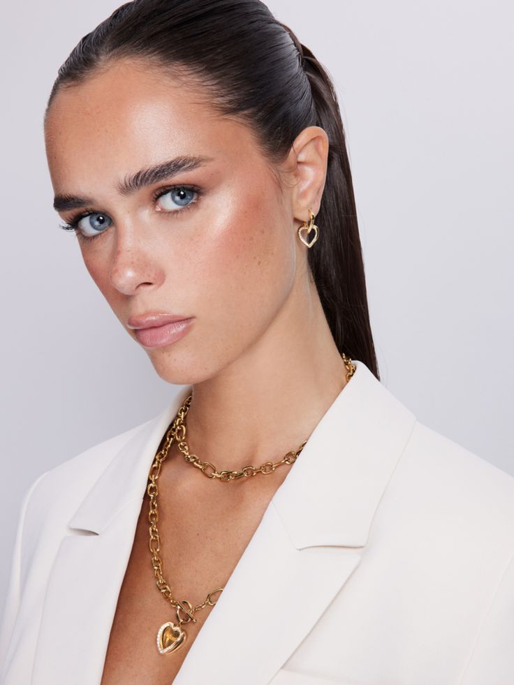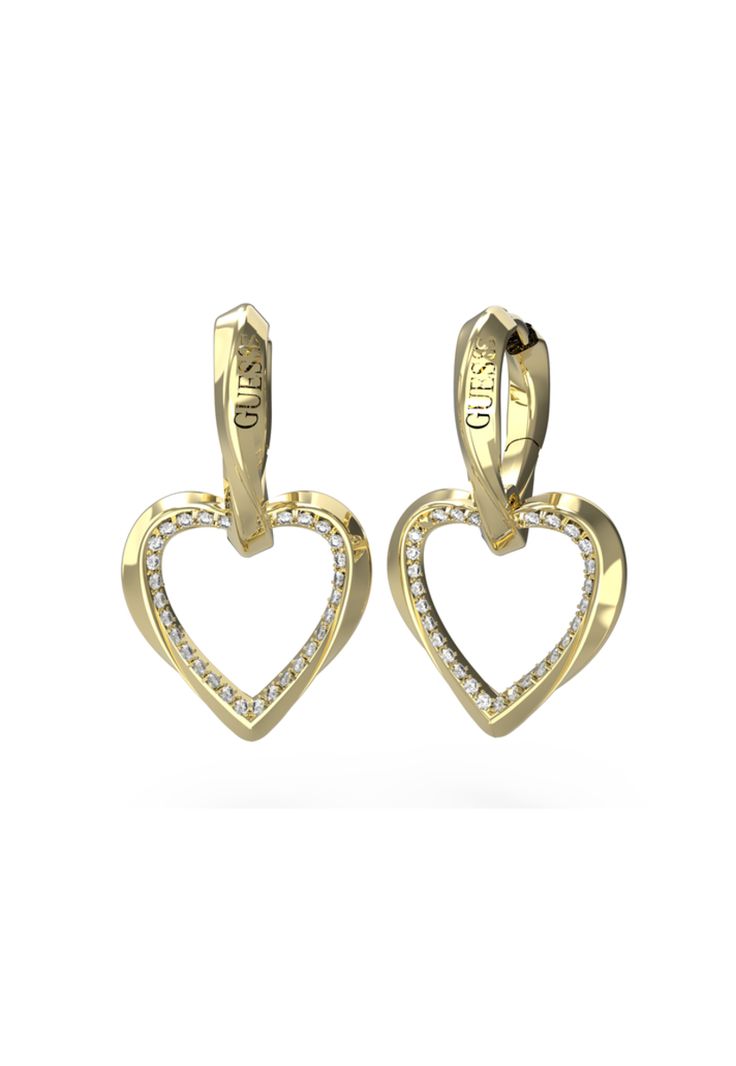 Pendientes colgantes dorados en forma de corazón rodeados de cristales.