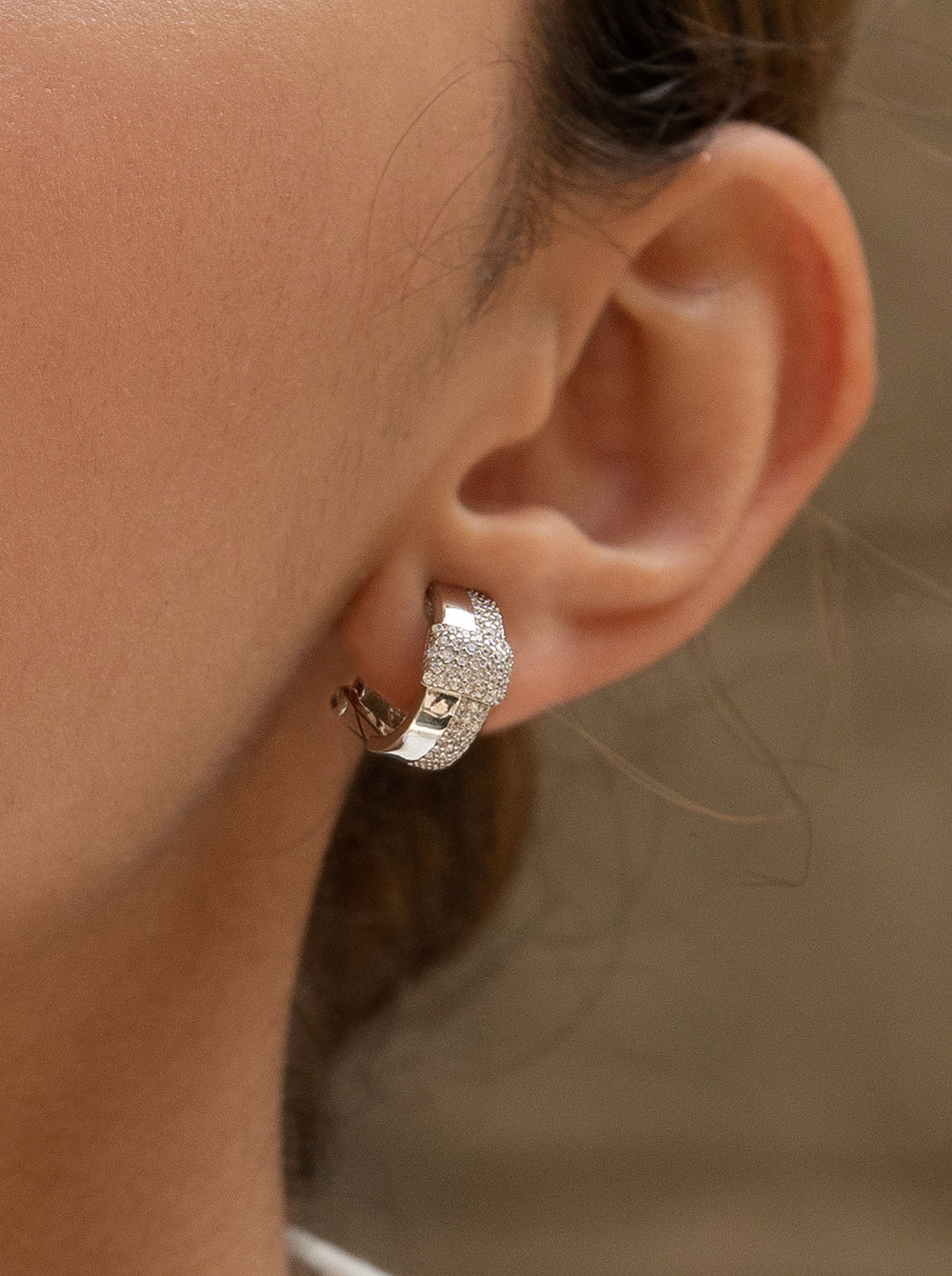 Pendientes de plata estilo omega con diseño de doble raíl con una banda de circonitas blancas cruzada en el centro.