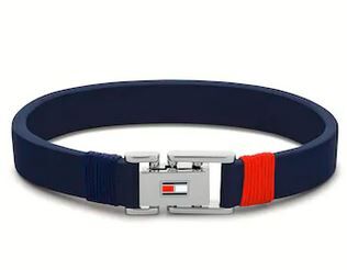 Pulsera de la marca Tommy Hilfiger para hombre, elaborada en piel azul con detalles en hilo azul y rojo. Con cierre en acero inoxidable en color plateado con el logo de la marca en esmalte.