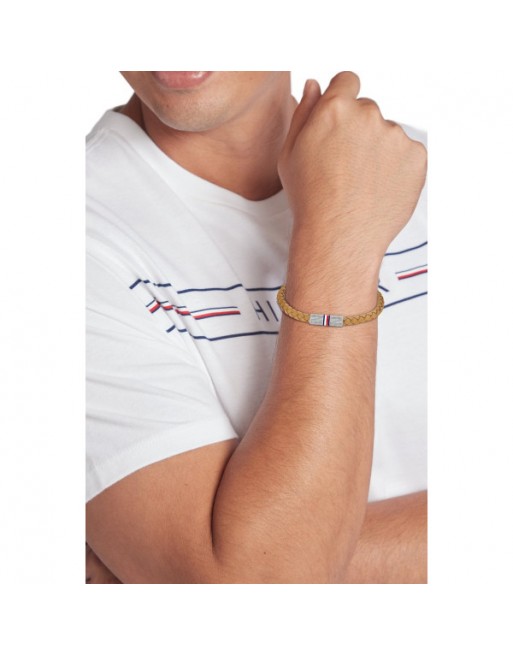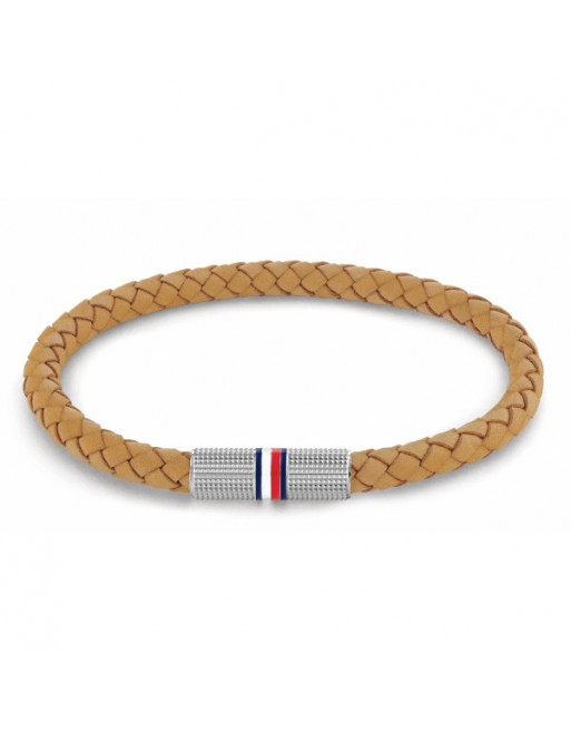 Pulsera para hombre de la firma Tommy Hilfiger modelo Cosmopolitan, elaborada con tira trenzada de cuero beige con cierre magnético de acero inoxidable e hipoalergénico decorado con una textura única y con zona central de esmalte con el logotipo de la marca, una pieza de estilo náutico altamente combinable.