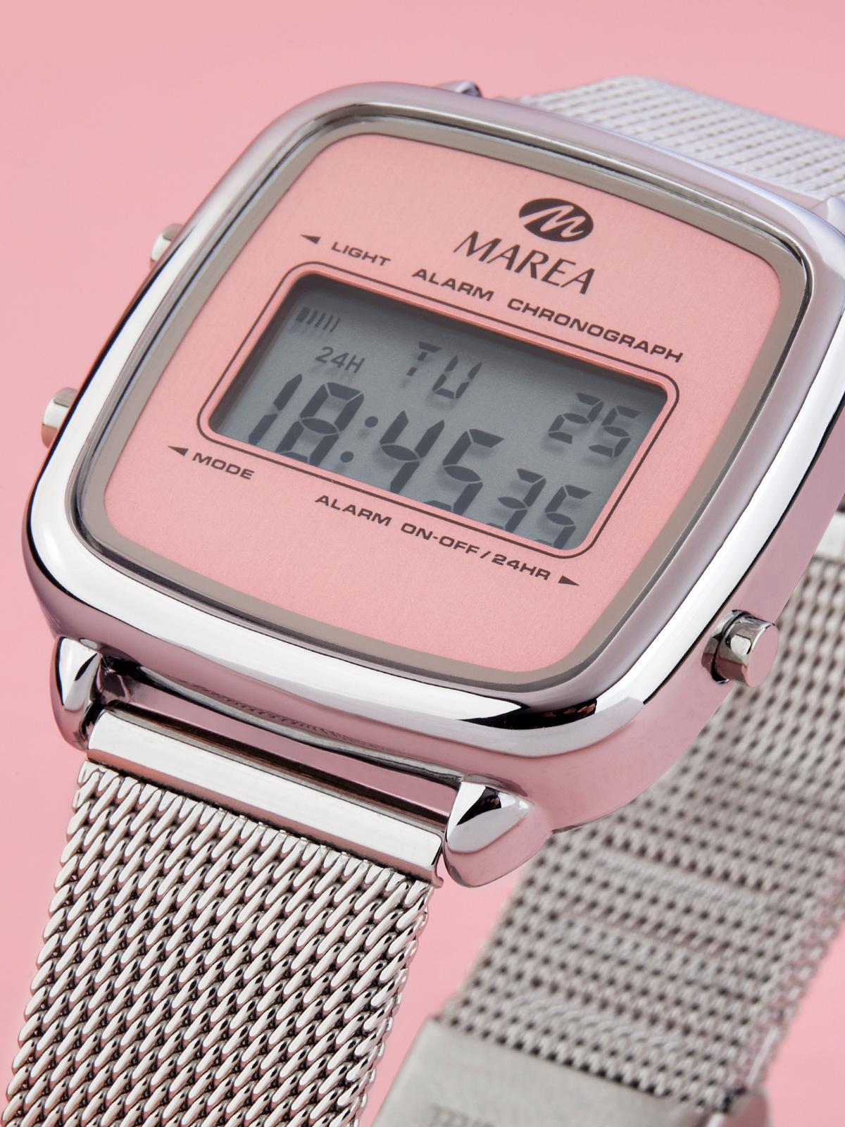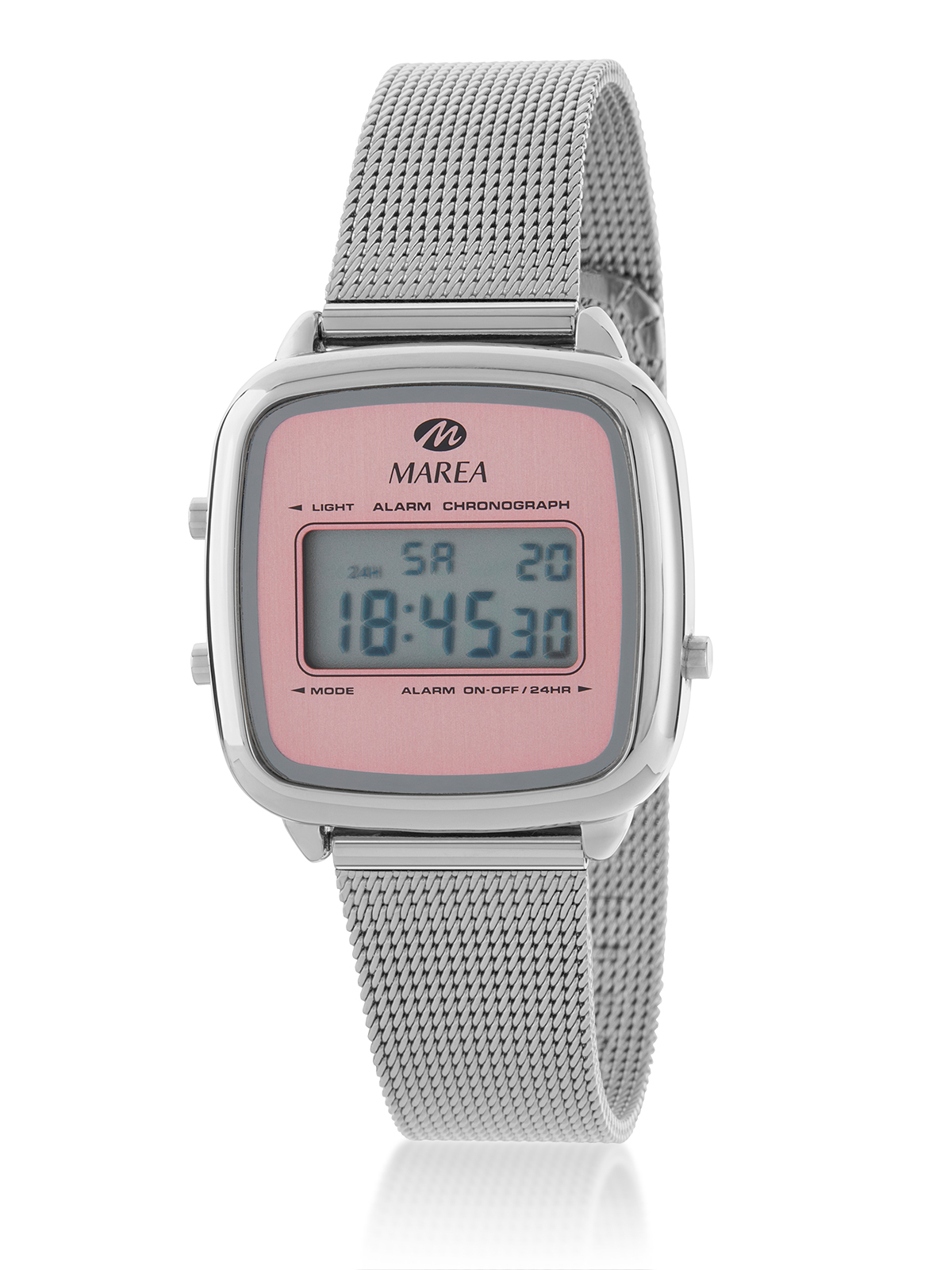 Características: Día de la semana, fecha, alarma diaria, pitido horario, formato 12/24 horas seleccionable, cronógrafo y luz.
