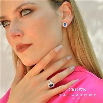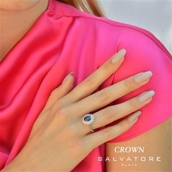 Sortija plata rodio óvalo circonita zafiro y circonitas blancas alrededor